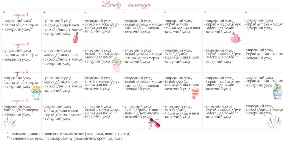 - Обозначьте для каждого дня недели процедуры по уходу за конкретной частью тела, например, понедельник — руки, вторник — ноги, пятница- волосы.