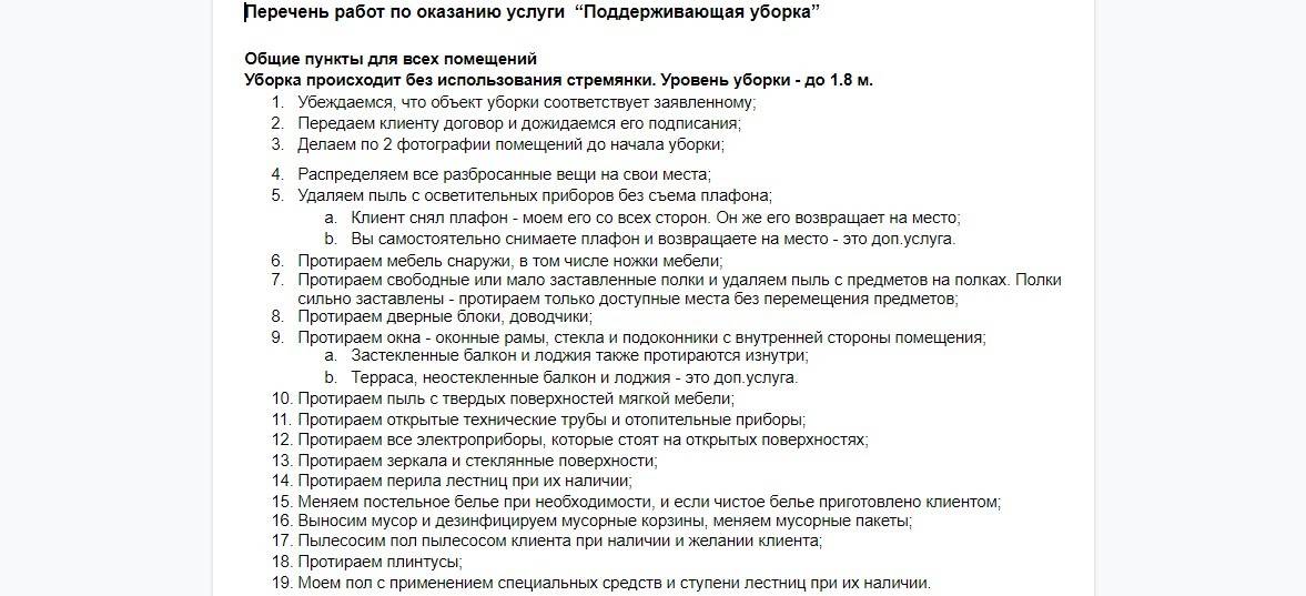 Отрывок из нашего регламента по проведению поддерживающей уборки