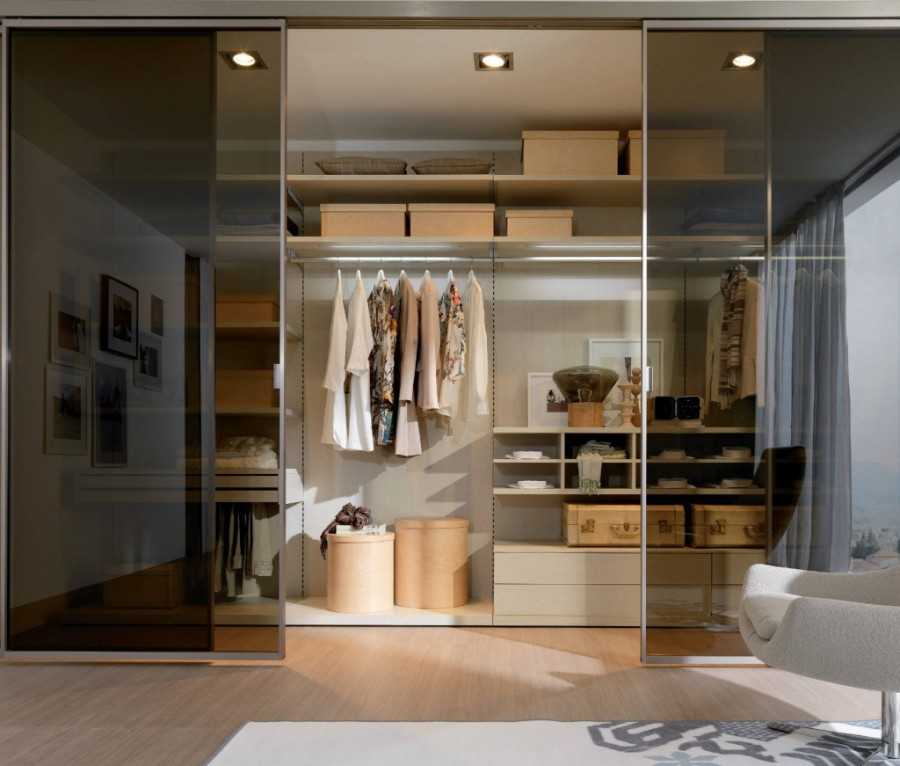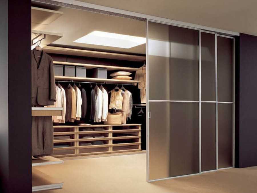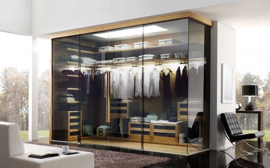 - Сделать стеклянную стенку. Она защитит одежду от пыли и не «съест» пространство.