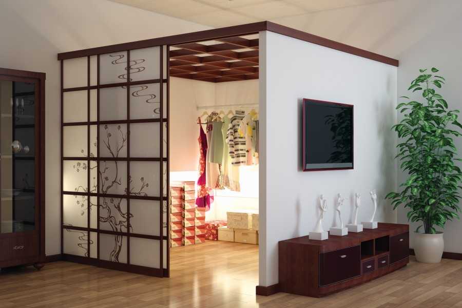 Для зонирования маленькой гардеробной в комнате можно