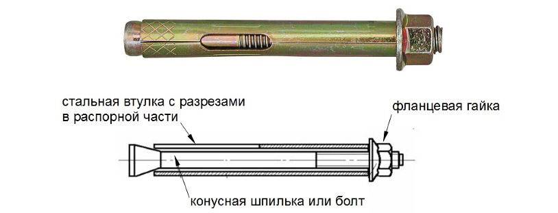 Анкер данного типа, распорная или клиновая втулка которого имеет укороченную длину, также представляет собой модификацию крепежного изделия с гайкой. Клиновым элементом, разжимающим такую втулку, является обратный конец резьбовой части болта, имеющий коническую форму.