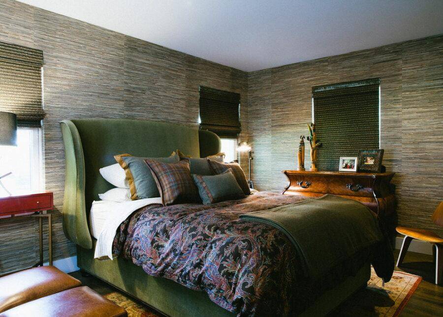 Безопасной, спокойной и приятной для спокойного отдыха и сна выглядит спальня, где цветовая тональность естественная и текстурная. Такой настрой создают бамбуковые обои в интерьере спальни. Их дополнительные функции – тепло- и шумоизоляции — благоприятно сказываются на крепком и здоровом сне. А это плюс в интерьере для спальной комнаты.