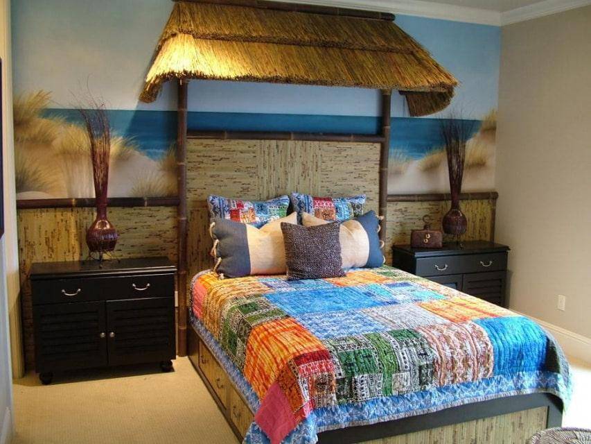 Бамбуковые полотна подарят спальне уют и тепло тропического домика. Их можно сочетать с однотонной отделкой стен, в этом случае дизайн будет спокойнее, или полностью оформить ими комнату.