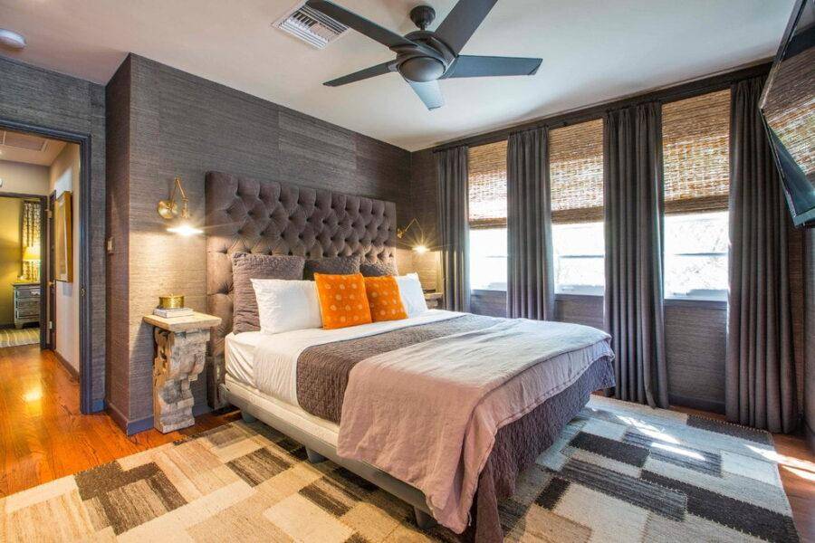 Интересным интерьерным решением станет частичная отделка, например стена над изголовьем кровати или дверной проем.