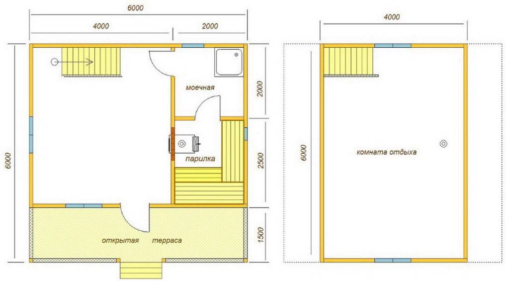Первый этаж такой бани может планируется исходя из обязательного наличия парной размером не менее, чем 4 м2. Планируют также предбанник, моечную и санузел. Причем санузел может занимать минимальную площадь (2 м2), а предбанник должен быть достаточно просторным. В любом помещении необходимы окна и двери. Баня — не исключение, но в парной окно не делается. В предбаннике достаточно маленького окошечка, а вот в предбаннике обустраивается обычное окно. Дверные проемы, ради сохранения тепла не делают большими — высота их около 1,7 м.