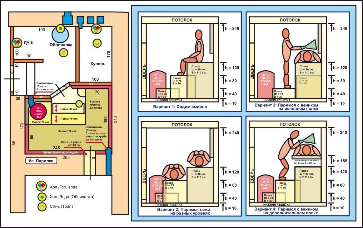 - На последующем этапе происходит разделение внутреннего объема бани на функциональные зоны. Традиционная современная баня имеет парильное отделение, исходя из расчета не менее 1 кв. м. на 1 чел, моечное отделение, полезной площадью не менее 4 кв.м., комнату отдыха, функционально совмещенную с предбанником. Исходя из общепринятой практики площадь комнаты отдыха должна быть на 50% больше заложенной площади парильного отделения. Здесь же проектируется высота потолков. Опять же, практический опыт показывает, что в парильном отделении потолок должен располагаться на высоте порядка 115 см. от верхнего среза печки каменки, но его общая высота не должна превышать 225 см, исходя из соображений рациональной вентиляции и теплосбережения. Полки, в целях экономии полезного пространства должны крепиться к стене. Длина полка не менее 650 мм, ширина не менее 470 мм. Верхняя полка всей ступенчатой системы набора полков должна располагаться на высоте, не более 1200 мм от уровня настила, что должно обеспечить приемлемый уровень температурного режима в его зоне;