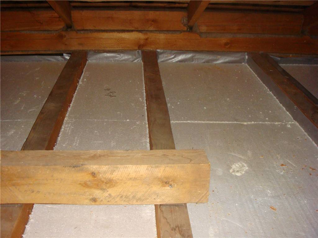 - прибейте к потолочным балкам снизу обрезные доски, толщины достаточно 20 мм;