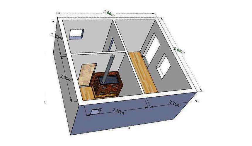 Стандартная планировка бани предусматривает предбанник, парную и моечную. Строение возводится на капитальном фундаменте, надежно теплоизолируется.