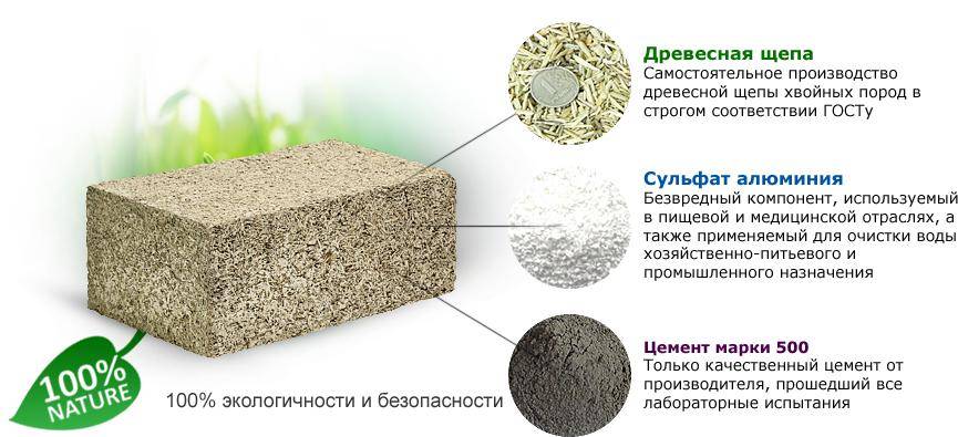 Основным составляющим материалом служат опилки из дерева, в качестве вяжущих средств добавляются известь, песок и вода.