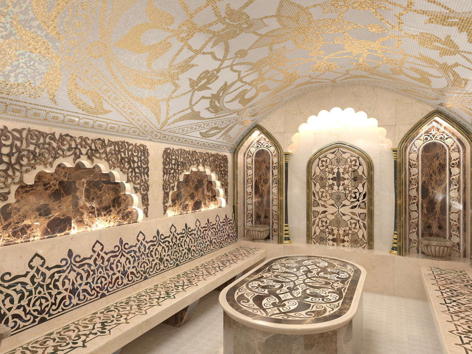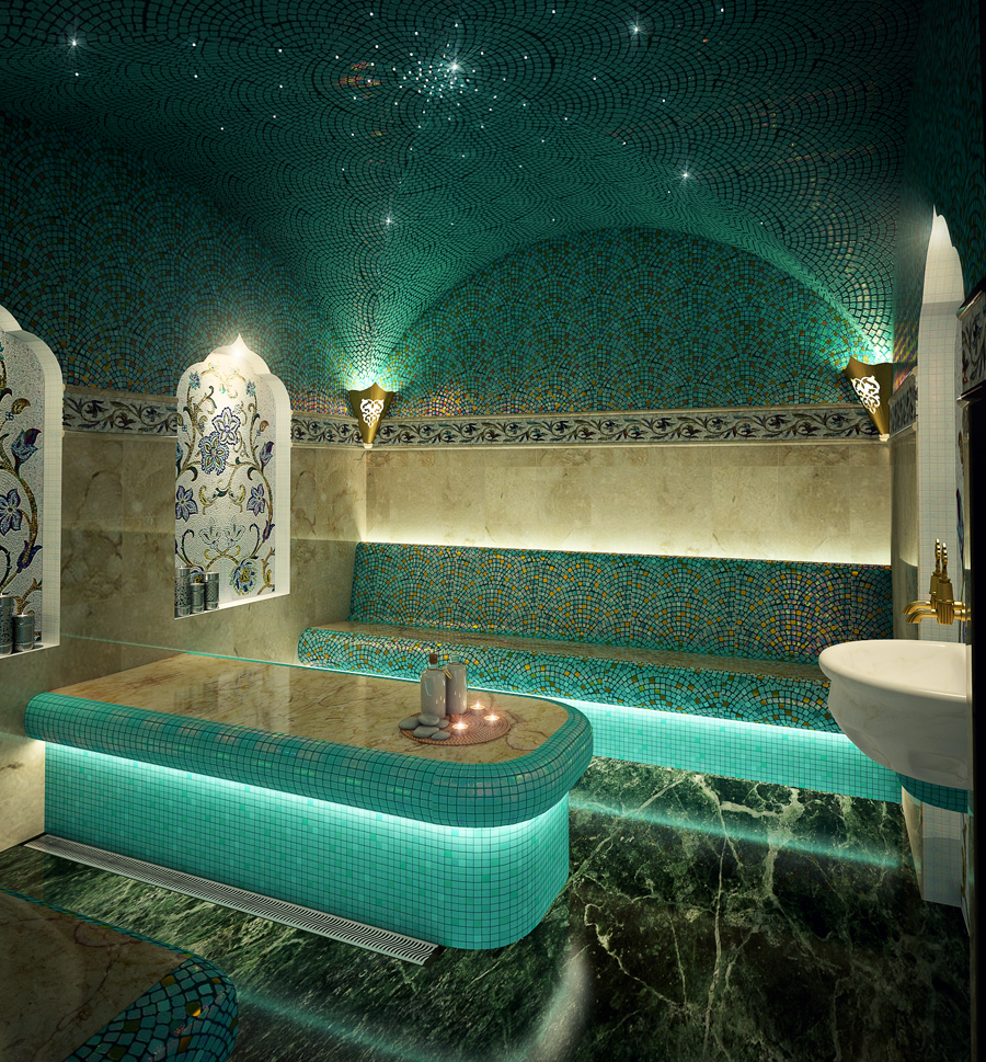 При составлении проекта для самостоятельного возведения хаммама вы можете исключить или добавить что-то другое. Важную роль в хаммаме играет создание внутренней атмосферы. Для отделки лучше всего подойдет мрамор. Также вы можете разместить в разных частях бани восточные аксессуары.