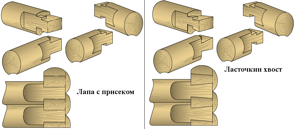 Угловое соединение бревен должно быть теплым. Получить его можно за счет соединения в лапу (при соединении без остатка) и за счет соединения в чашу (при соединении с остатком).