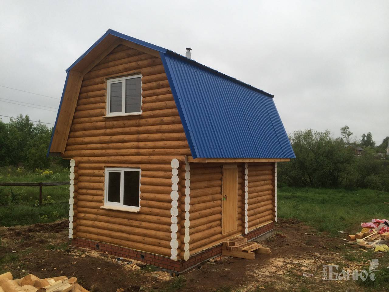 Легче всего с нуля достраивается баня из бруса – с мансардой деревянной конструкции она практически не меняет своего веса, а идеальная прямоугольная планировка позволяет избежать лишних затрат. Кроме того, если второй этаж еще и будет использоваться постоянно, то есть смысл после укладки межэтажного перекрытия достроить стены на 1-1,2 метра в высоту, и только после этого возводить фронтоны.