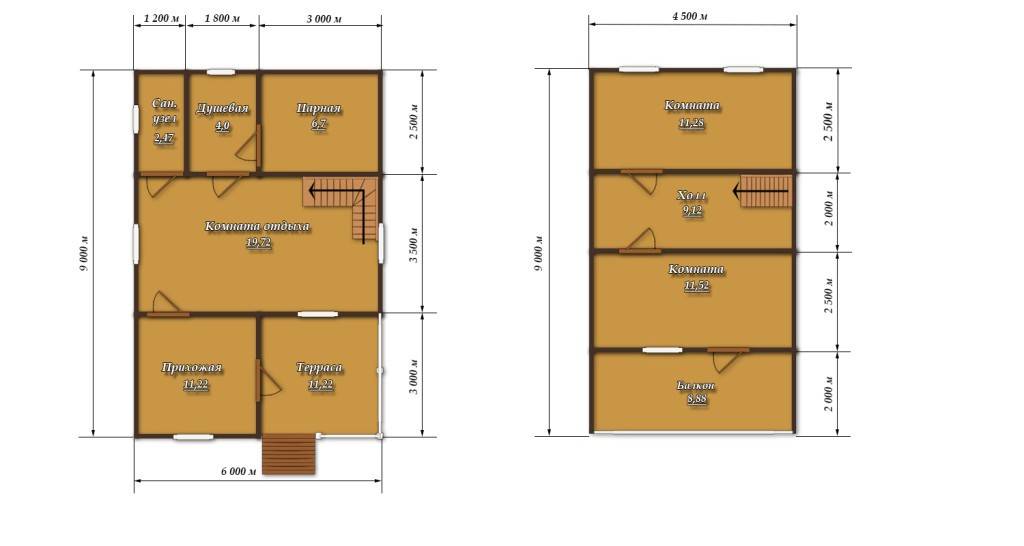 На первом этаже расположена комната отдыха (гостиная), санузел и непосредственно парная, а также коридор с выходом на террасу. На втором этаже размещены две спальни с просторным балконом.
