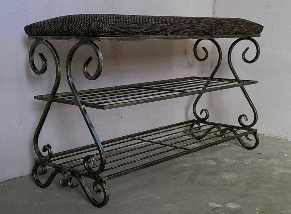 - Служит декоративным элементом. Кованнаяхудожественная деталь банкетки в прихожую отличается прочностью, надёжностью и утончённым внешним видом.