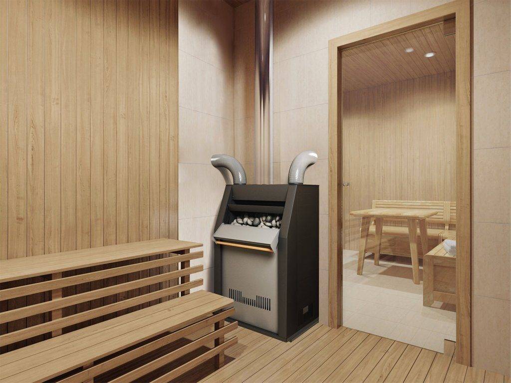 - Наличие полной безопасности. Человек, поливающий камни водой, никогда не обожжется паром. Установка топливной камеры в соседнем помещении гарантирует безопасность присутствующим в бане людям.