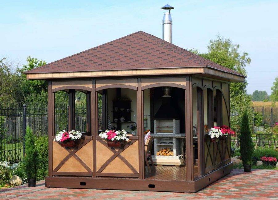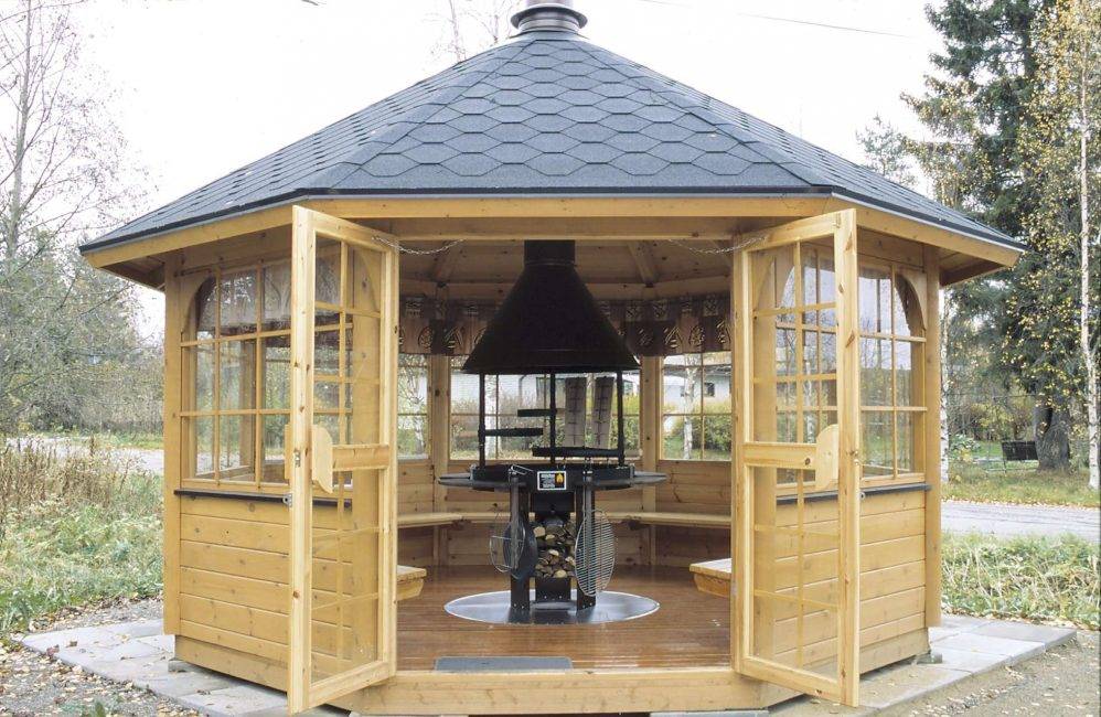- Беседка. Но если у закрытой конструкции в ней есть стационарные стены, то в конструкции универсальной она состоит из столбов, поддерживающих крышу. В жаркие летние дни пространство между столбами остается открытым, чтобы внутрь залетал прохладный ветерок. А вот осенью или в дождливую погоду его закрывают либо деревянные панели, либо металлическая решетка, либо ткань.