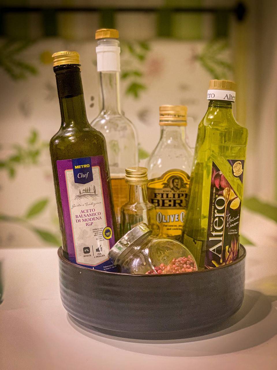 У меня на кухне стоит маленький поднос, где собрано всё, чем я пользуюсь каждый день: яблочный и бальзамический уксусы, оливковое и растительное масло, соль, перец, приправа.
