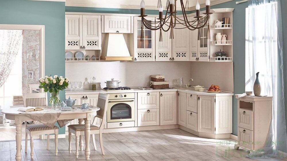 Юг Франции, романтика европейской деревни. Здесь будет уместны не холодные оттенки белого при выборе гарнитура, а теплые — например, цвета слоновой кости. Здесь нет ничего яркого, пестрого, все оттенки приглушенные.