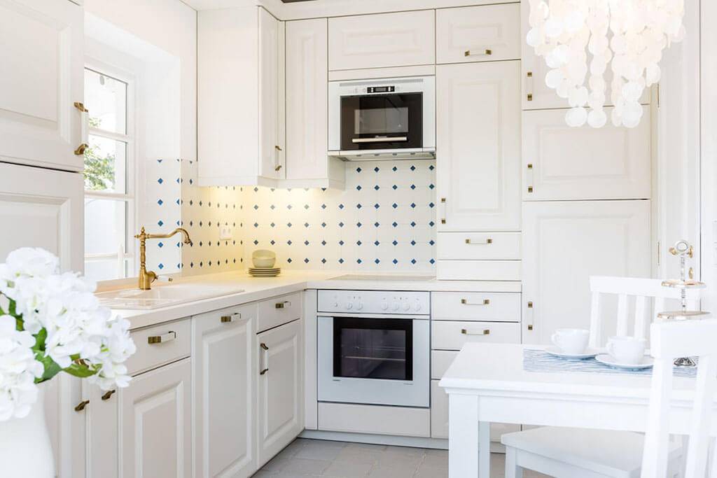 Для маленькой кухни белый оттенок – спасение, возможность расширить пространство, а в сочетании, к примеру, с зеркальным фартуком или стеной, отличная возможность расширить пространство.