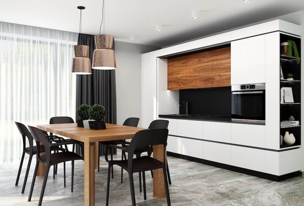 Эффектно выглядит светлая комната с отдельными черными элементами. На фото с преобладанием светлого тона темные детали не вносят значительной визуальной нагрузки, а скорее выделяют главные компоненты в интерьере. Все большие элементы комнаты выполнены в светлом цвете, при этом черными могут быть рабочие поверхности, светильники, стулья и пол. Преобладание яркого цвета визуально увеличивает свободное пространство, поэтому в большей мере подходит для маленькой квадратуры помещения.