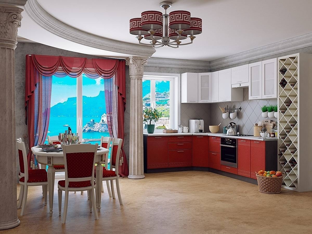 - Все яркие оттенки будут более насыщенными и глубокими на белом фоне. Наиболее популярным является решение с красной отделкой. С такими акцентами даже маленькая кухня будет яркой и интересной. Для более просторных помещений выбирают комбинации и для гарнитура: белый верх, огненный низ.