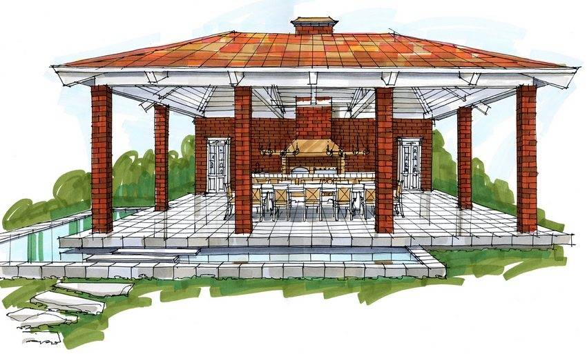 Эскиз открытой беседки с печкой