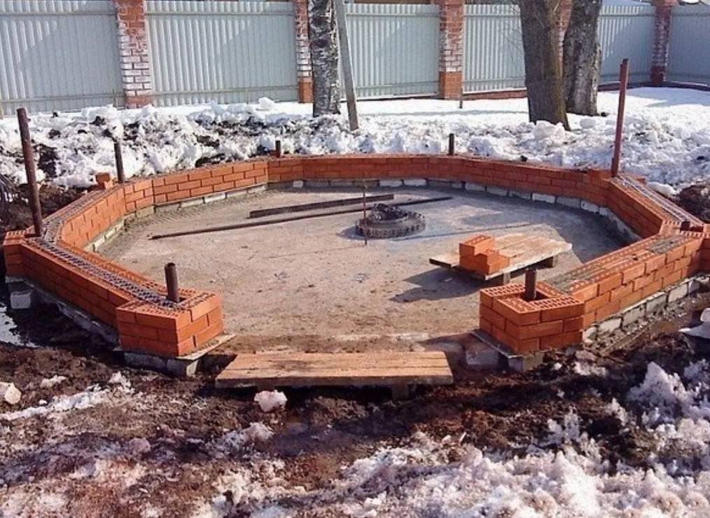 Кирпичная беседка закрытого типа располагает строительству колонн и стен до самого потолка, с возможностью дальнейшей установки окон.