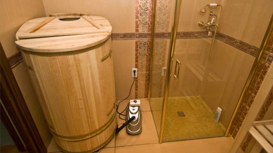- Человек, одетый в купальник, заходит в кабину и садится на специальную скамейку, расположенную в бочке. Закрывается дверь, а вокруг шеи наматывается плотное полотенце, которое предотвращает выход пара наружу.