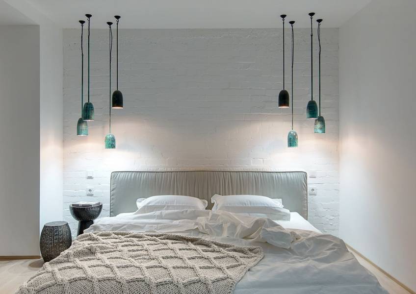 - Подвесной светильник. Обычно состоит из 1-3 лампочек, которые дают неяркий рассеянный свет. Смотрится такая конструкция очень современно и идеально подходит людям, чья спальня обыграна в стиле лофт. Единственное, за чем стоит следить – это за высотой расположения светильника. Он не должен нависать слишком низко.