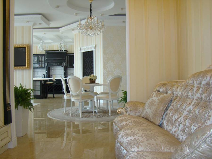 Разные зоны можно отделить друг от друга посредством различных отделочных материалов. К примеру, пол в обеденной зоне возможно обложить плиткой, а в гостиной – ламинатом. Таким образом каждый материал будет относиться к определенной территории, заметно ее выделяя. Речь может идти не только о напольных, но и о стеновых и даже потолочных материалах.