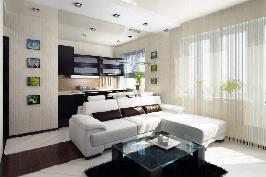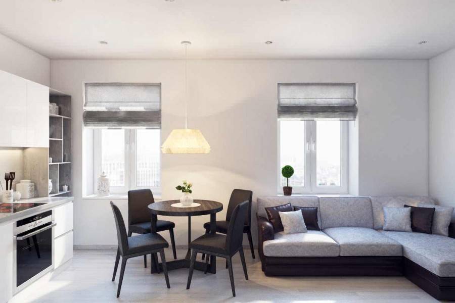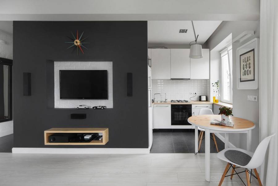 В некоторых случаях смещается вход в кухню, чтобы визуально удлинить гостиную. В этом случае либо помещение кухни становится проходным, либо выносится дополнительная дверь в коридор.