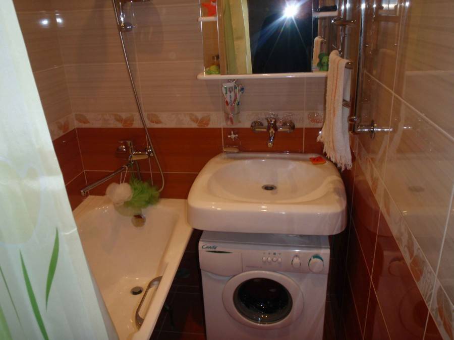 Возможность вмещения стиральной машины шириной 34 см без существенной перепланировки тоже вполне возможна. В этом случае можно использовать умывальник в виде чаши.
