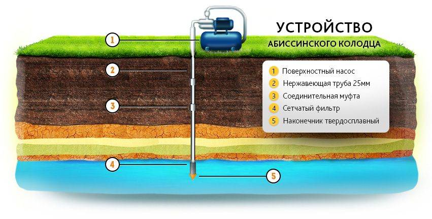 - абиссинские колодцы не применяют на каменистой почве. Это конструкции с небольшой мощностью — они не справятся с твердым грунтом;