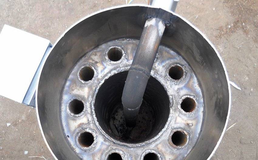 Нижний и верхний модуль представляют собой цилиндрические ёмкости диаметром 35–45 см, которые соединяются толстотелой стальной трубой диаметром не менее 100 мм. Её длина должна быть не менее 40 см, иначе агрегат не обеспечит условий насыщения масляных паров кислородом. В этих же целях по всей поверхности вертикальной камеры выполнены сверления диаметром не менее 9–10 мм, которые располагают в шахматном порядке.