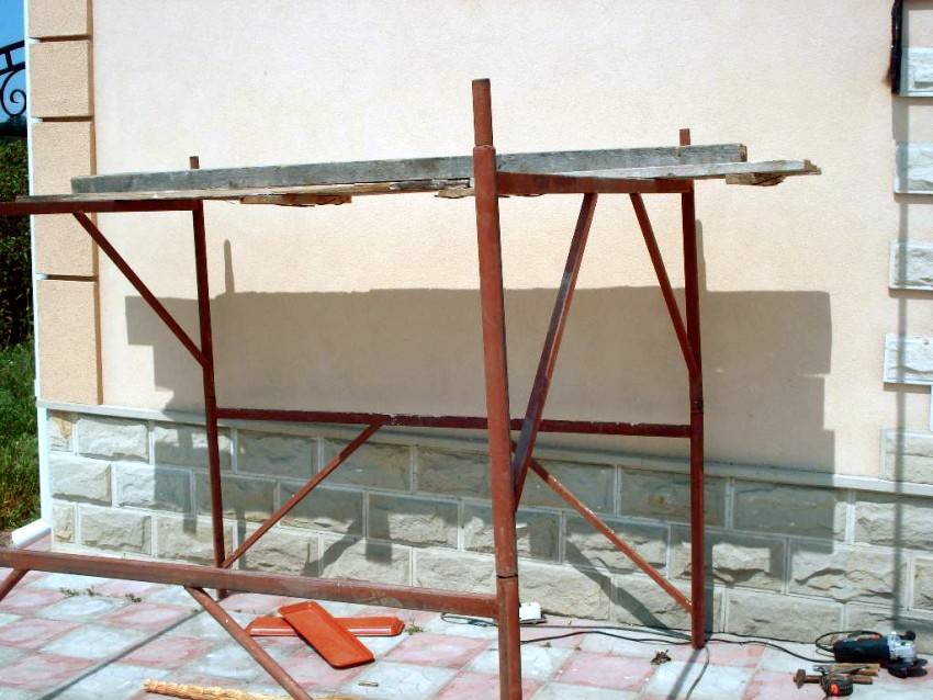 Конструкцию часто называют армянскими лесами, причем вертикальная часть в них может быть укорочена, тогда подмости приобретают вид треугольника, в основание которых упирается доска. На ней концентрируется вся нагрузка.