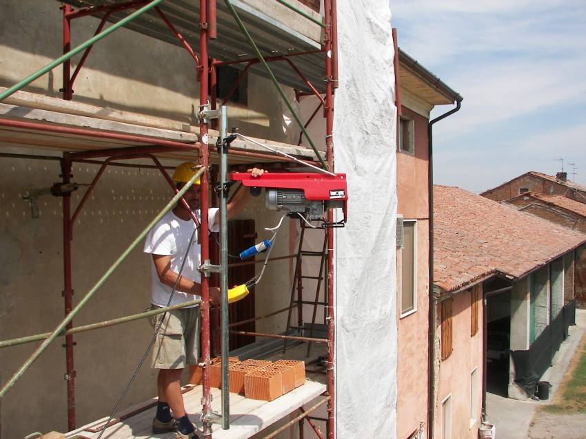 Сетчатая ткань также эффективно защищает от агрессивного воздействия солнечных лучей, дождя, снега. С таким элементом гораздо комфортнее и легче работать, нежели без него. Весомый недостаток сетки заключается в том, что она непременно начинает накапливать и задерживать в себе пыль. По ходу шлифовки поверхности фасада либо во время работ с токсичными компонентами сетку лучше снимать и пользоваться при этом респираторами для дополнительной защиты.