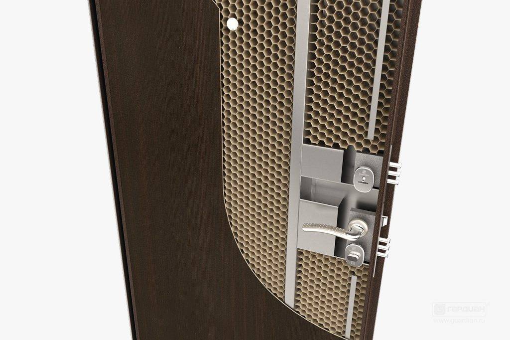 демонтируется обшивка на одной из сторон. Если дверь разборная, т.е. ее можно вскрыть без нарушения одного из слоев, то демонтированную плоскость двери отставляют в сторону, а затем устанавливают на место. В противном случае, одна из сторон двери (обычно внутренняя) срезается, а в последствии заменяется на лист ДСП и отделочный материал;
