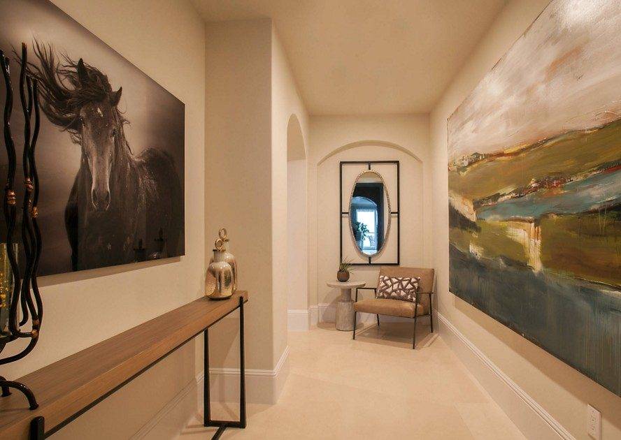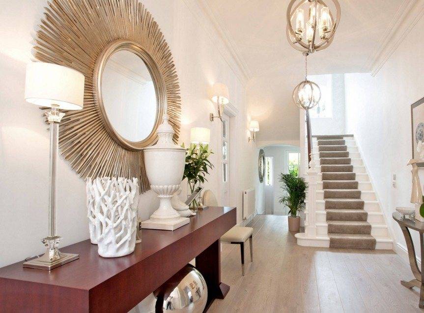 Стильный и современный интерьер можно создать при помощи контрастных цветовых решений. Так, достаточно выигрышно будут смотреться яркие пристенные столики, которые будут гармонично контрастировать со стенами и полом светлых пастельных тонов. Единственное правило обстановки при таком варианте – мебель не должна быть слишком громоздкой, иначе интерьер мгновенно станет перегруженным. Украсить готовый интерьер можно не только мебелью, но и различными аксессуарами, например, можно повесить на стену коллаж из фотографий или распределить по коридору картины. Данное решение придаст классическому интерьеру уюта.
