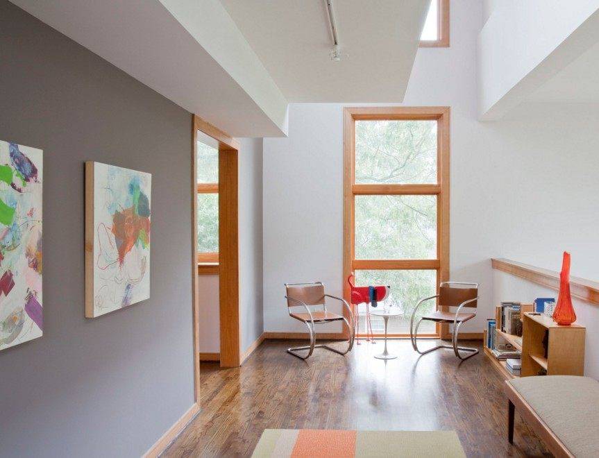 Можно комбинировать цвета. Например, в узком пространстве самые длинные стены окрашивают (оклеивают) белым цветом, а короткие отделывают на тон темнее.