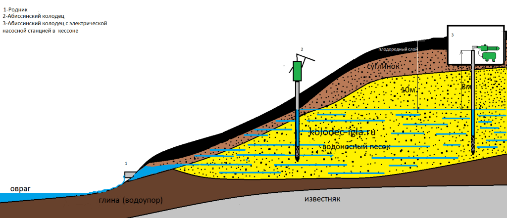 Максимальная глубина абиссинского колодца — 12-13 метров. Такой колодец можно монтировать в любом удобном месте, избегая близкого расположения сточных канав или дренажных коллекторов. Также в месте водозабора не должна встречаться глина, чтобы не забился фильтр. Нужно учесть, что скважину иглу следует консервировать на зиму: демонтировать насос, слить воду, поставить заглушку на скважину.