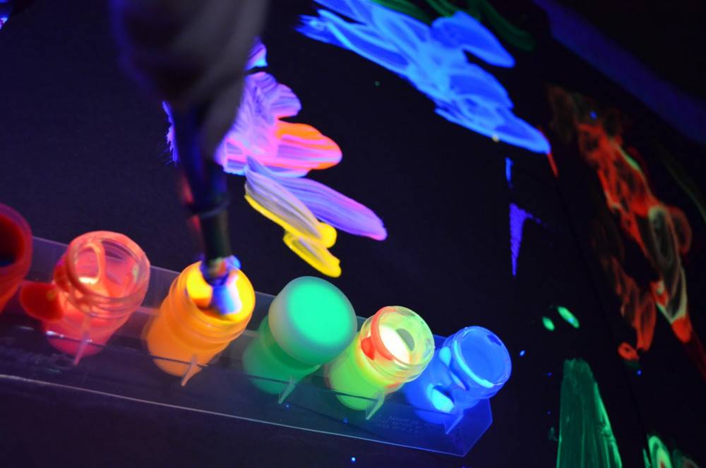 - флуоресцентные. Эти светящиеся красители проявляют себя только при попадании на них ультрафиолетовых лучей, сами по себе в темноте они не светятся. Чаще всего их используют для оформления внутри помещений – баров, ночных клубов, а также в качестве тюнинга авто. В производстве флуоресцентных составов используют акриловые вещества, благодаря которым краски являются экологически чистыми и безопасными для человека. Их изготавливают разных цветов, используя различные пигменты. Наиболее эффектные – это красный, желтый, оранжевый, розовый, зеленый оттенки;