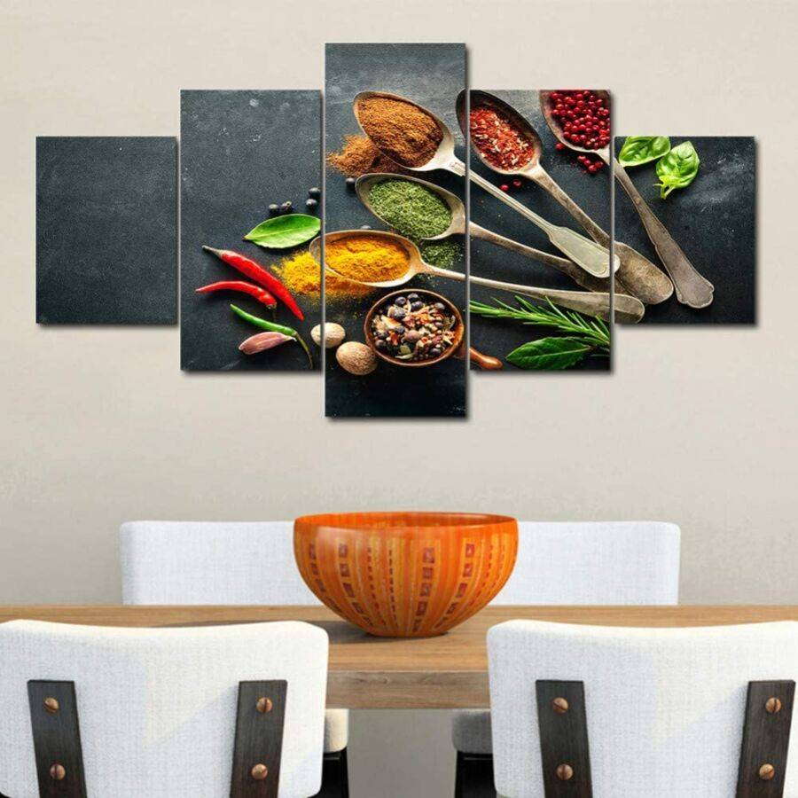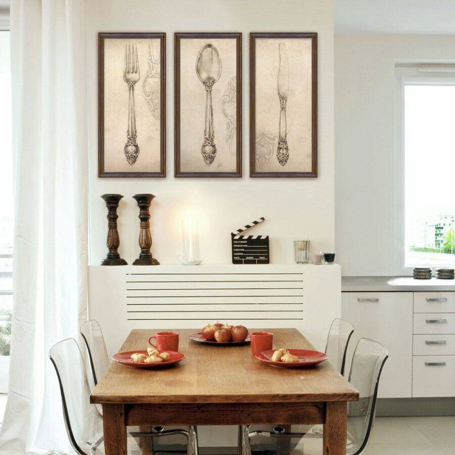Украсить пустующие стены можно небольшими фотографиями или акварельными рисунками под стеклом, панно или натюрмортами. Можно сделать композицию из рамок и подручных средств (засушенных листьев, кофейных зерен, специй и т.д.). Опытные мастерицы повесят вышитые крестиком картинки, в тон изразцам кухонного фартука. Оригинальные часы станут настоящей находкой для помещения, претендующего «на изюминку».