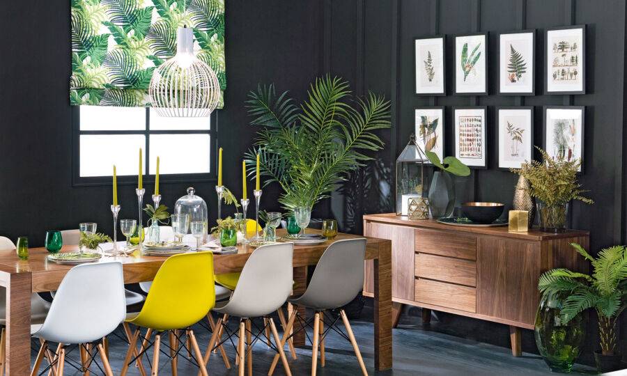 Обратите внимание на это обилие зелени! Комнатные растения и цветы – отличный вариант оживить и освежить интерьер. Сочетая их с посудой и аксессуарами в тон, вы можете добиться потрясающего эффекта