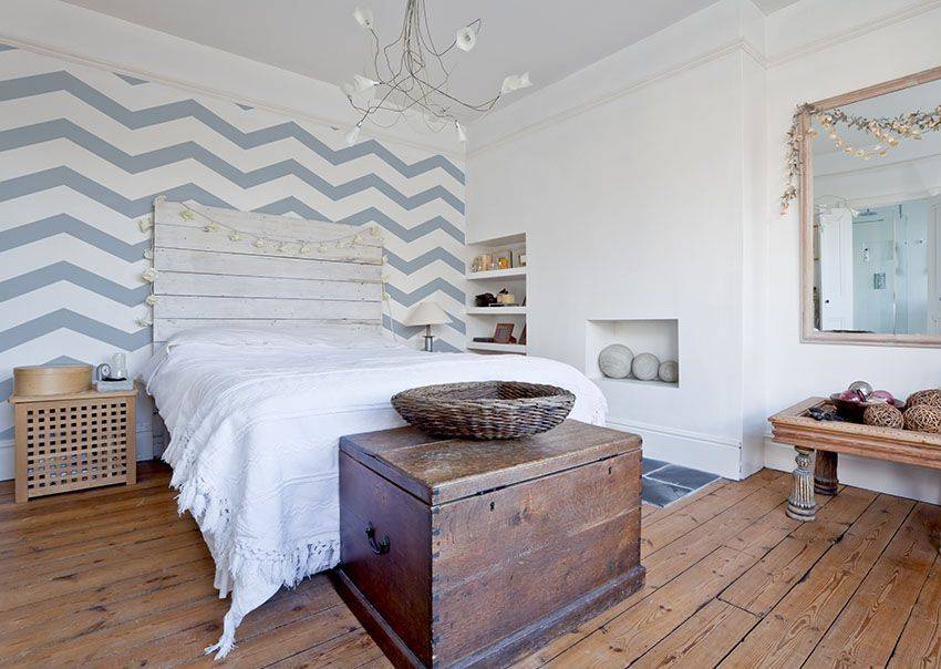 Любители экстравагантности оценят зигзагообразные линии на стенах. Однако дизайнеры не рекомендуют увлекаться таким оформлением в жилых помещениях. Подобный способ больше подходит для новомодных кафе или клубов. В комнате, таким образом, лучше оформить одну акцентную стену, например, стену в изголовье кровати в спальне, за диваном в гостиной или нижнюю часть стены, сочетая ее с рисунком на полу.