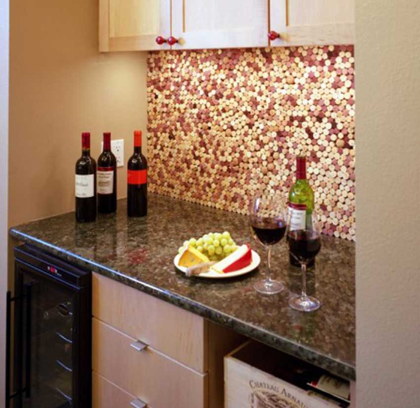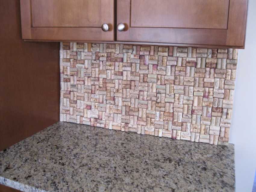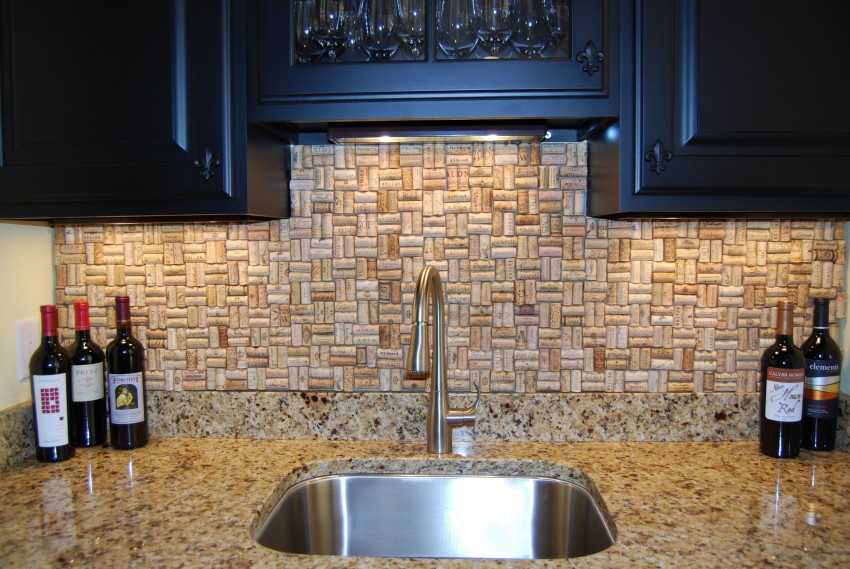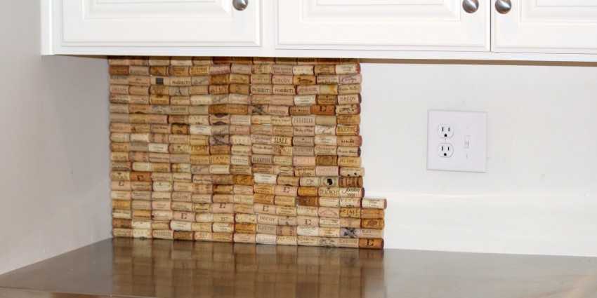 Порежьте пробки вдоль на 2 части. Перед приклеиванием желательно окрасить стену в черный цвет, так фартук будет смотреться красивее. Клеить пробки нужно жидкими гвоздями.