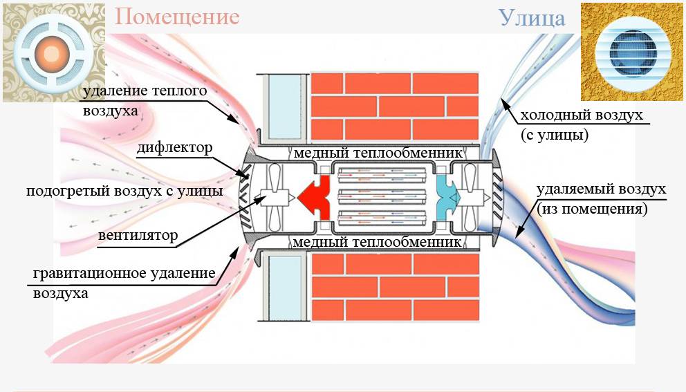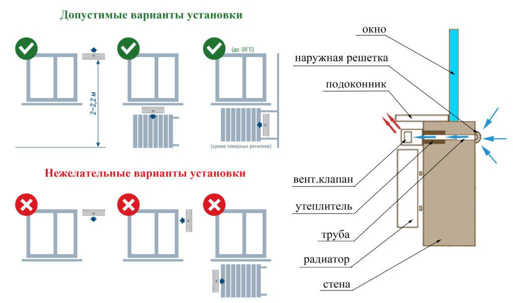 Обычные клапаны монтируются над регистрами отопления, чтобы зимний воздух согревался восходящими конвекционными потоками. В рекуператорах использована схема «труба в трубе», поэтому входящие массы согреваются исходящими потоками. Их устанавливают в любом удобном месте, независимо от расположения батарей, простенков.