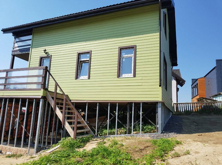 Дополнительно можно закрыть пространством под ростверком металлическим сайдингом или профилированным листом, которые предотвратят попадание под пол снега, осадков и холодного воздуха.