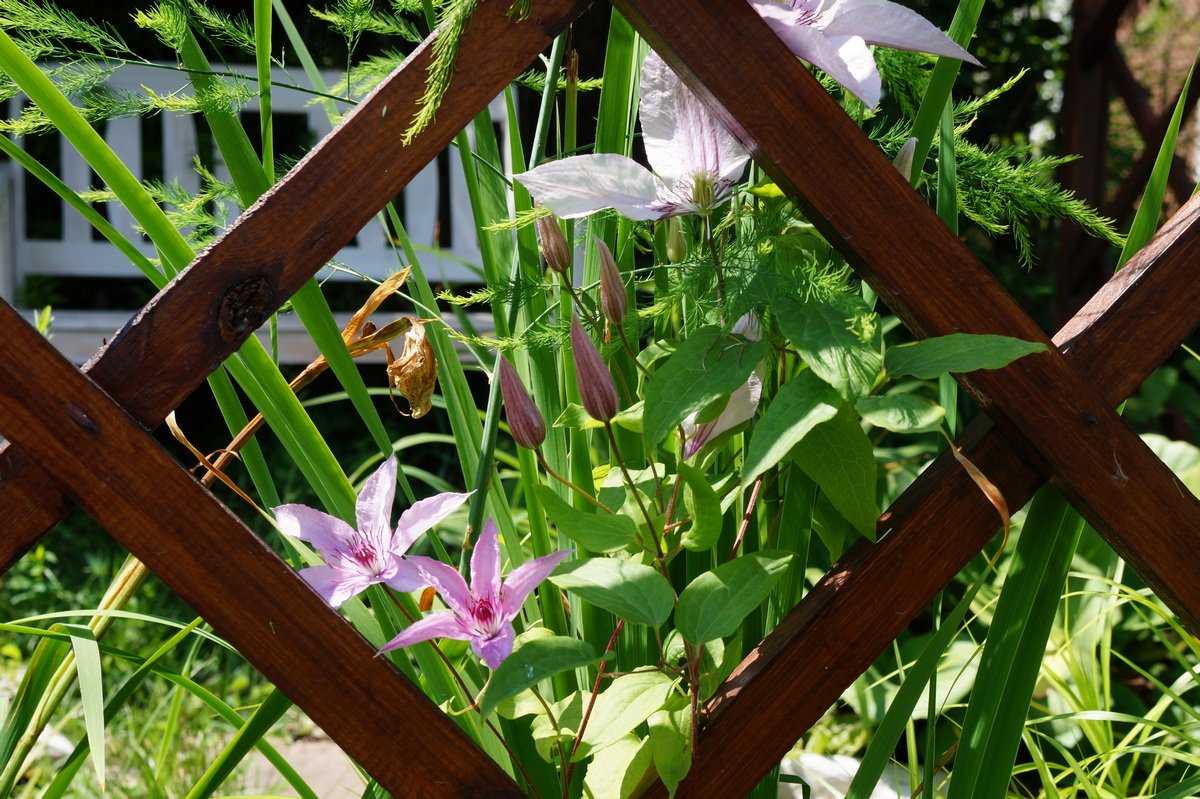 Лучше, чтобы для вьющихся растений использовались шпалеры на надежном деревянном каркасе. Крепить лучше гвоздями, опорные деревянные столбики цементируют.