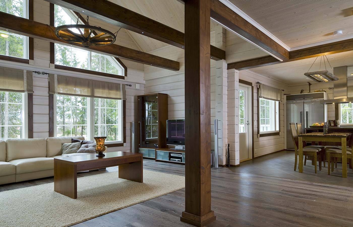 Наиболее выгодные варианты оформления интерьера дома из бревен основаны на контрастных сочетаниях