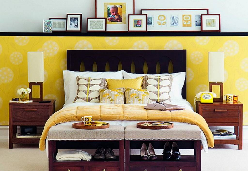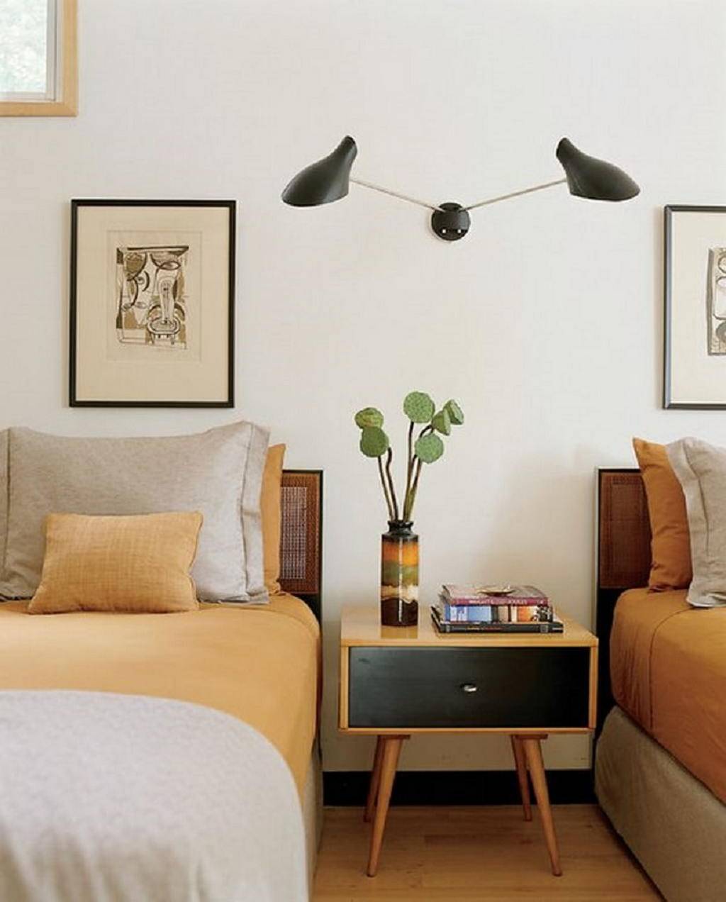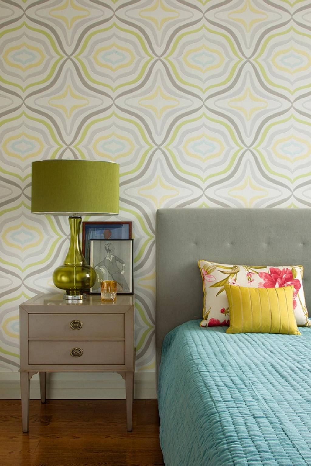 В ретро-стиле спальня может быть и яркой, например, желтой, ведь это цвет солнца и радости. В комнате сна и отдыха также актуальны обои с геометрическими узорами, перекликающиеся, например, с орнаментом штор или другим текстилем. Фактуры искусственных тканей балуют богатством выбора.